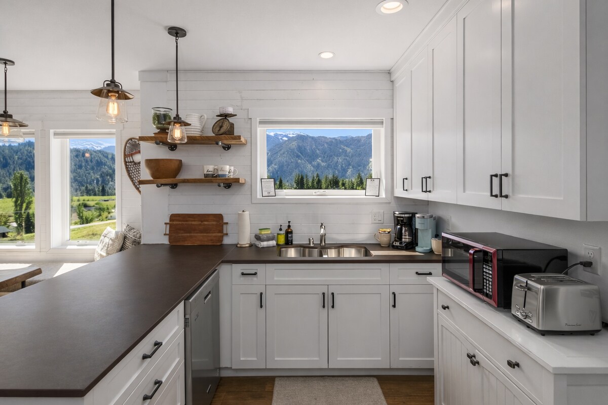 Everyone that enters the cabin absolutely loves it! Cozy & clean, great room concept. Be part of the group as you prepare your meals in the kitchen & large island with beautiful quartz. Kitchen is completely equipped, including coffee, teas, simple items like foil, baggies etc. No expense was spared when building this very cute cabin. Barn doors cover the 2 bedrooms, the bathrooms have sliding pocket doors. Stackable washer/dryer & heated tile floors in both bathrooms. We hope you enjoy it