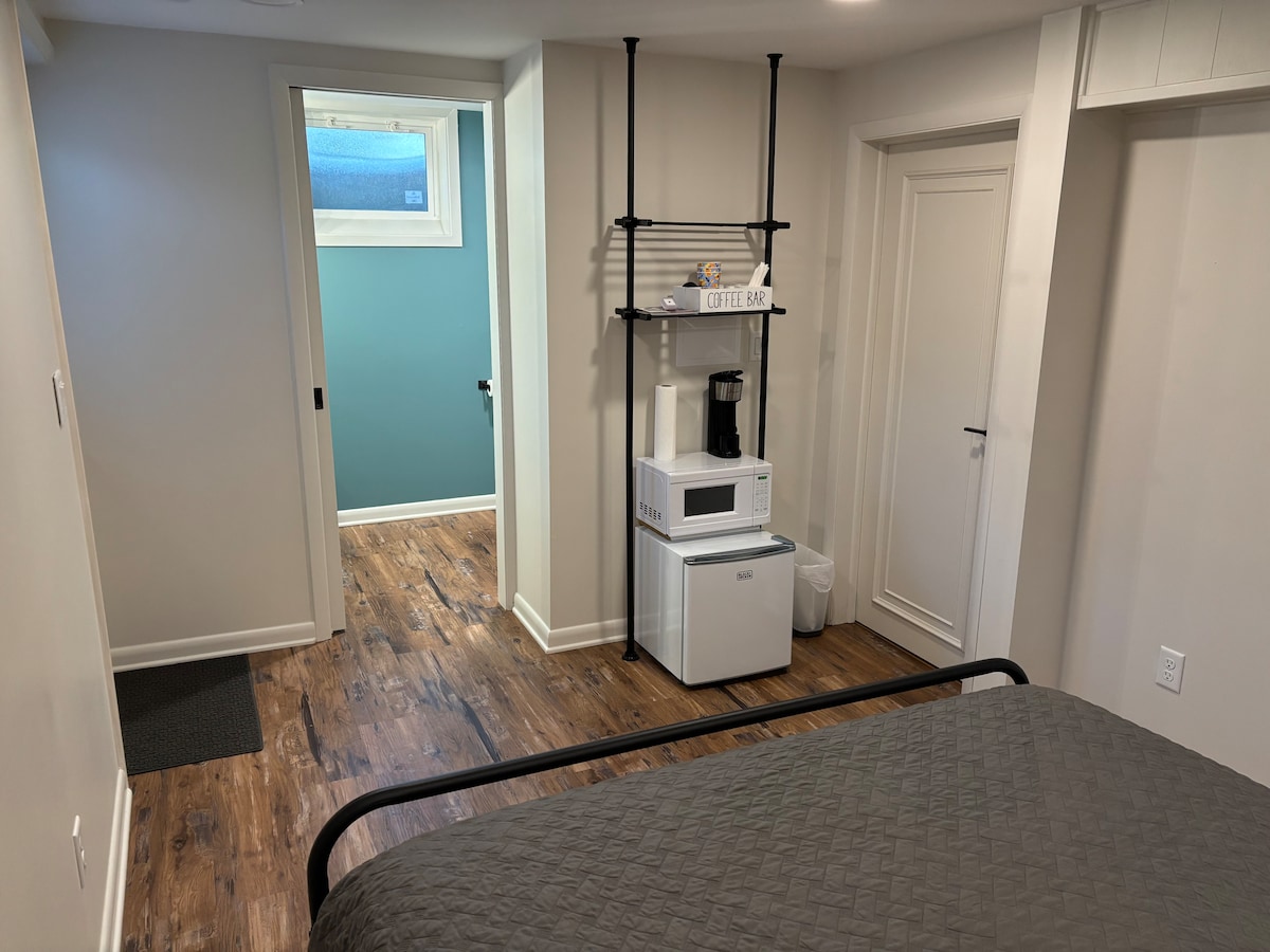 Entrada privada a una sala de estar de nivel inferior, cama tamaño queen y baño. La sala de estar incluye una mesa de desayuno, nevera, microondas, cafetera Keurig, café, hervidor de agua eléctrico, té, edulcorante y crema. El dormitorio incluye un armario y una cómoda. Disfruta de wifi gratuito y de un espacio completamente para ti. ¡Entra y sal a tu antojo! Estamos a 2 millas del campus de IU, del centro de la ciudad, de las tiendas y del entretenimiento. ¡Damos la bienvenida a todos!