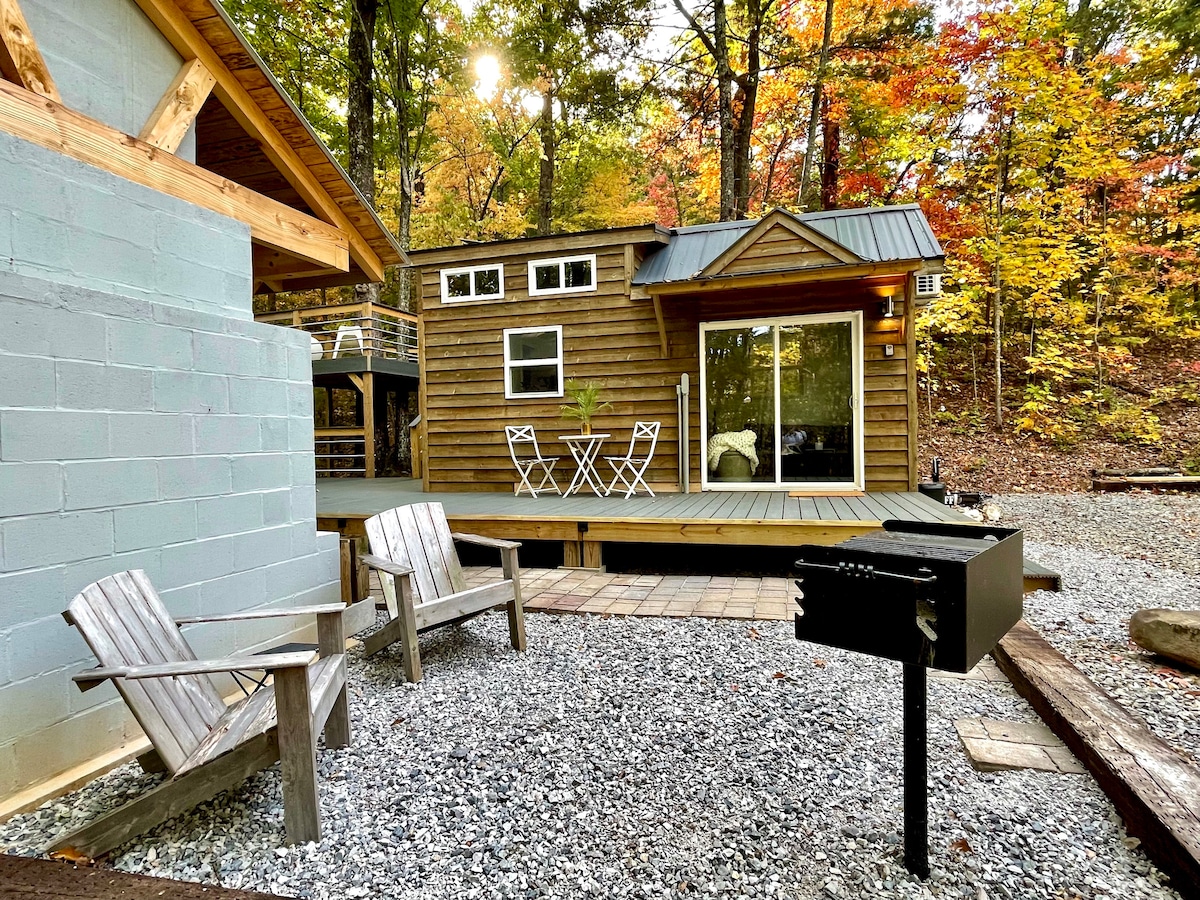 Escápate a una minicasa de lujo con un dormitorio único estilo casa en el árbol, ubicada en 14 hectáreas privadas que bordean el Bosque Nacional Cherokee. Salga a una amplia sala de estar exterior cubierta con una chimenea de piedra de 4,2 metros (14 pies) y un jacuzzi privado rodeado de apacibles vistas al bosque. Diseñado cuidadosamente para ofrecer comodidad y relajación, el alojamiento incluye sábanas de alta calidad, batas suaves, champán de cortesía, café, agua y refrigerios seleccionados para que disfrutes de una estadía sin complicaciones y de primer nivel.