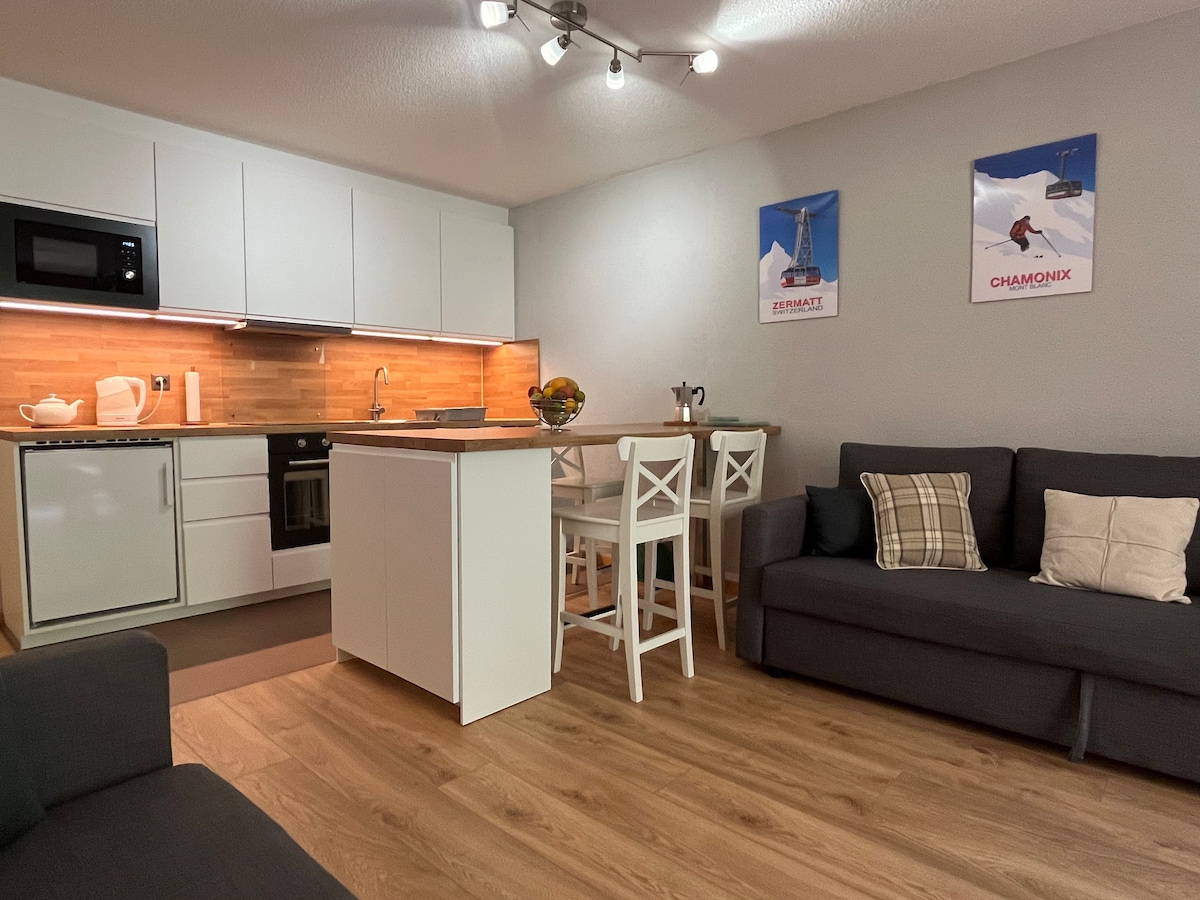 Apartamento de 1,5 dormitorios (40 metros cuadrados) recientemente renovado en un moderno chalet. Con una ubicación tranquila cerca de la calle principal del pueblo (a 3 minutos a pie), también a poca distancia del teleférico (a 10 minutos, proporcionamos una taquilla de esquí en la estación de teleférico). Todos los servicios necesarios están disponibles durante tu estancia. ¡Solo tienes que traer tus esquís!