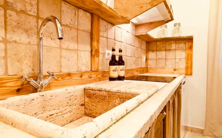 Apartamento en 2 niveles situado en el antiguo barrio Pisan de la ciudad alta de Bonifacio. Una primera escalera de piedra conduce a la sala de estar, cocina equipada con lavavajillas, lavadora y secadora. Una segunda escalera de madera más estrecha, lo lleva a la habitación con un pequeño vestidor y baño, inodoro, bidé, lavabos y una pequeña bañera. La terraza está en la extensión de la habitación con una gran vista de Cerdeña. Dos tumbonas, sombrillas, mesa y sillas.