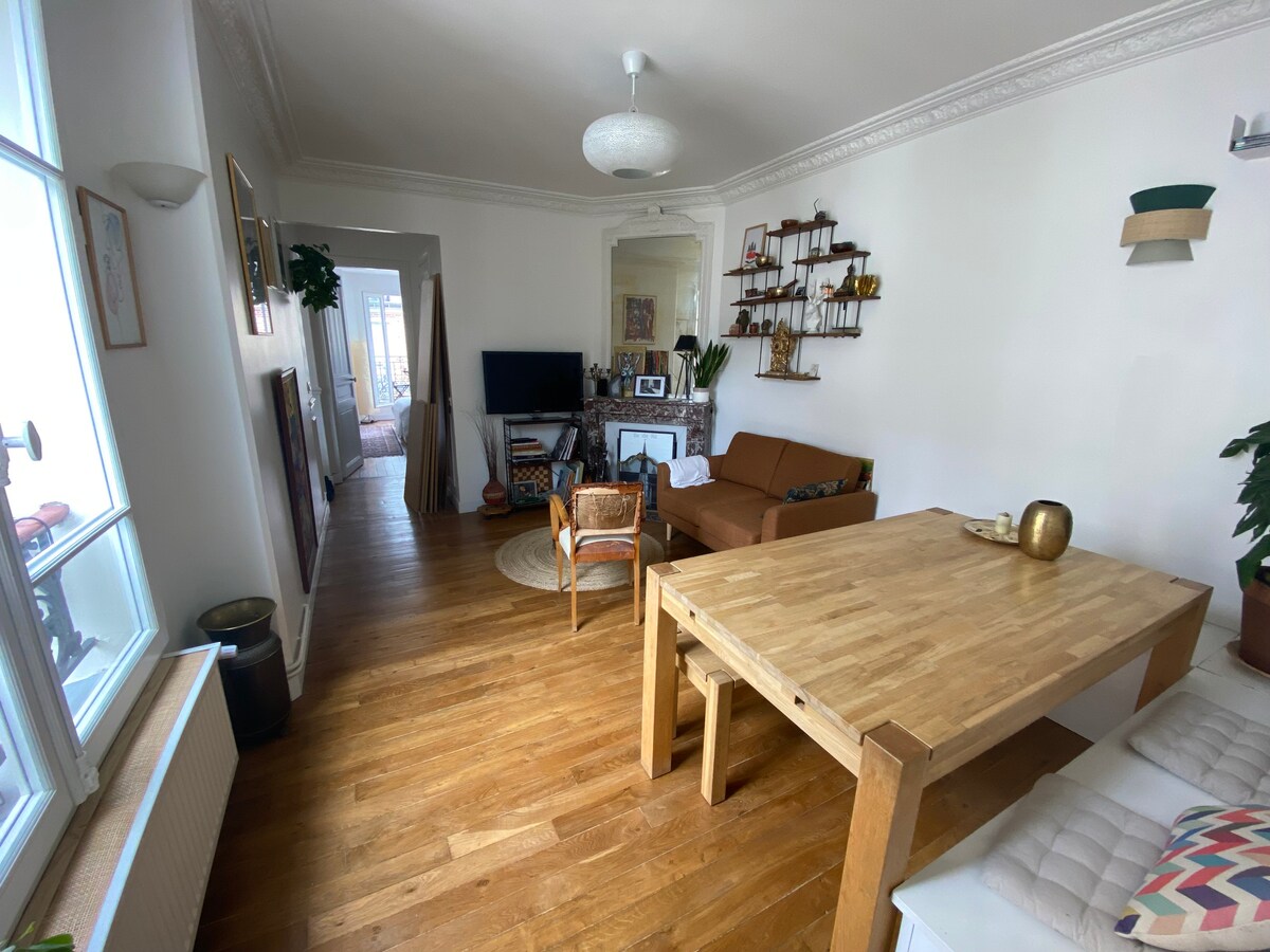 Tranquilo apartamento tradicional parisino en un edificio de piedra vestido del siglo XIX y calle en el quinto piso con ascensor : sala de estar doble, dormitorio, cocina totalmente equipada (lavavajillas y lavadora/secadora), balcón y parque subterráneo privado (4 minutos a pie). Lo amueblé y decoré con amor, incluidas pinturas. En un vecindario vibrante de tiendas y restaurantes, está a 2 minutos a pie del metro, desde el que todos los lugares imprescindibles de París están a 13-30 minutos de distancia.