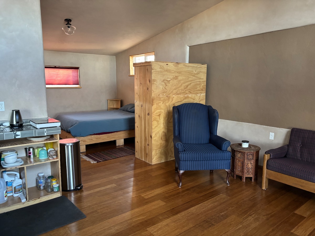 Quietly located in Mora County, this one bedroom tiny home offers spacious accommodations for up to four guests. A Queen size bed plus a queen size sleeper sofa provide for a comfortable short or long term stay. Plenty of parking and the property has RV connections, with water, septic, and 220 electrical connections. Spread out and feel the space. This home is practically new and has 2 mini splits with AC and Heat. You’re gonna love it and will be back!