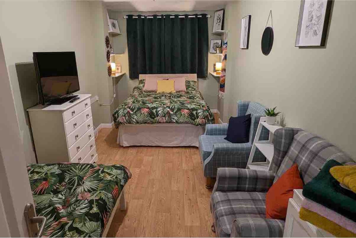 Apartamento tipo estudio limpio y ordenado, completamente separado (1 cama tamaño king + colchón opcional en el piso). Estacionamiento disponible para un auto en una entrada segura, cerrada y privada. El Anexo prioriza tu seguridad con puertas, ventanas y vigilancia integral de CCTV que cubren la residencia, los jardines y las áreas de estacionamiento. El centro de la ciudad de Hereford está a pocos pasos, al igual que Lugg Meadows, con encantadores paseos por el campo.