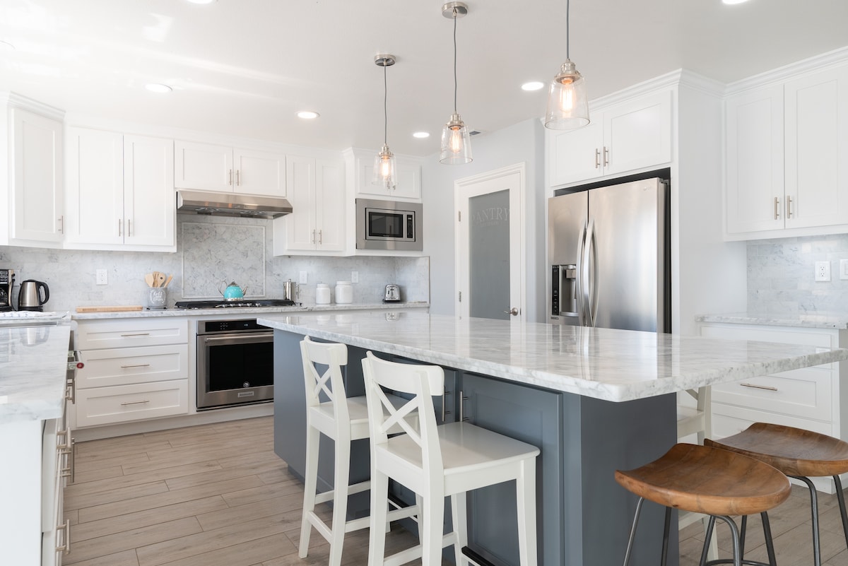 Welcome to your luxury retreat in Downtown Modesto! This fully remodeled 2BR/1.5BA Midcentury Modern home offers: • 1,150 sq ft of stylish double story home with spacious living space with new kitchen and baths • Large yard with paver-lined grass, Edison lights, and fire pit • 65” Smart TV, 1200mbps WiFi, 4K security system, and smart garage • Queen bed with desk, plus two twin beds, all with premium linens • Walking distance to fine dining, nightlife, and attractions