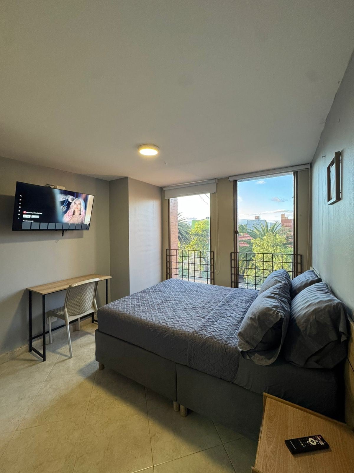 Este acogedor apartaestudio es de uso exclusivo, independiente y privado consta de una habitación amplia, con una cama doble, TV, clóset y mesa de escritorio, baño con agua caliente y una cocineta con nevera la cual tiene lo necesario para cocinar como ollas, loza, cubiertos y otros adicionales. El apartaestudio se encuentra ubicado en la parte de atras de la casa principal, por lo que la entrada es compartida entre ambos. El apartaestudio tiene una buena iluminación, es muy limpio y acogedor