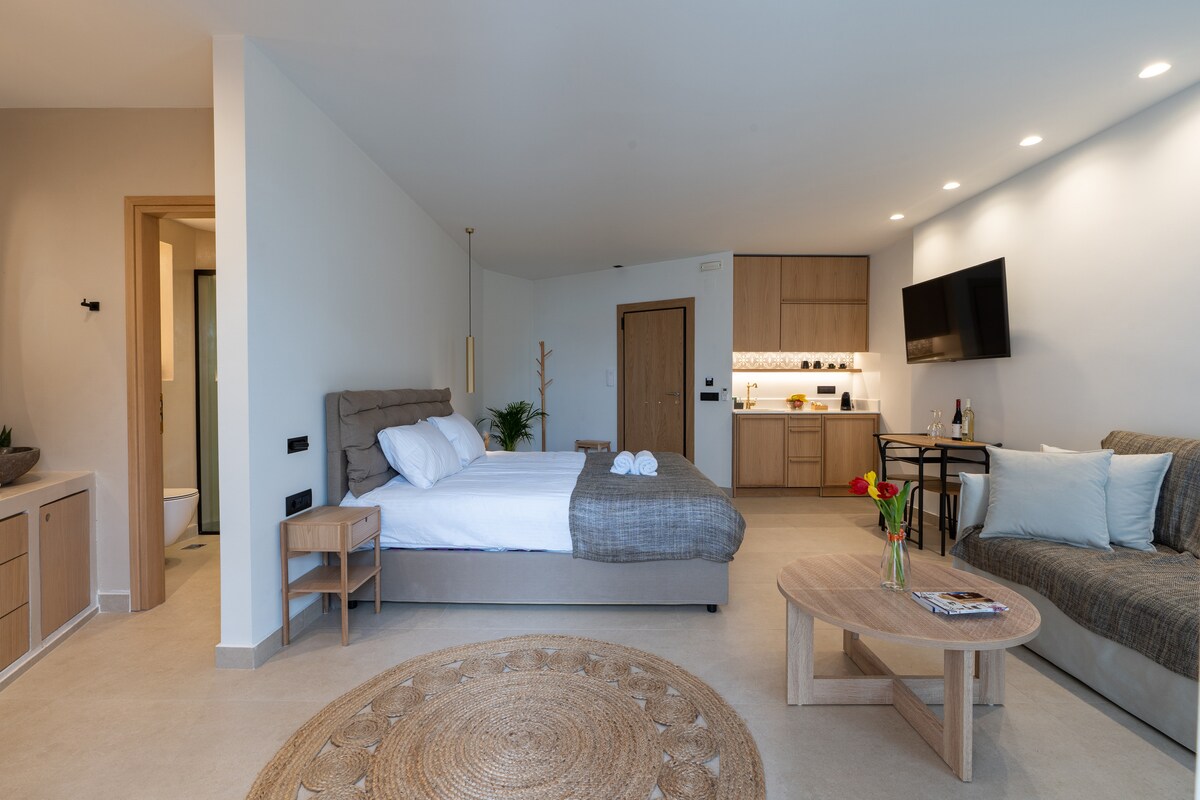 Αυτό το μόλις ανακαινισμένο πολυτελές στούντιο με εκπληκτική πανοραμική θέα στη θάλασσα και το ηλιοβασίλεμα, βρίσκεται στην κορφή ενός μικρού λόφου σε μία ήσυχη γειτονιά, με δωρεάν πάρκινγκ στο δρόμο.Η παλιά πόλη απέχει 12 λεπτά με τα πόδια. Διαθέτει ένα ενιαίο χώρο (υπνοδωμάτιο - κουζίνα) και ένα μπάνιο 27τμ περίπου πλήρως εξοπλισμένα. Επιτρέπεται για σας η χρήση όλων των χώρων του διπλανού πολυτελούς ξενοδοχείου MACARIS SUITES & SPA παραγγέλνοντας κάποιο φαγητό η ποτό.