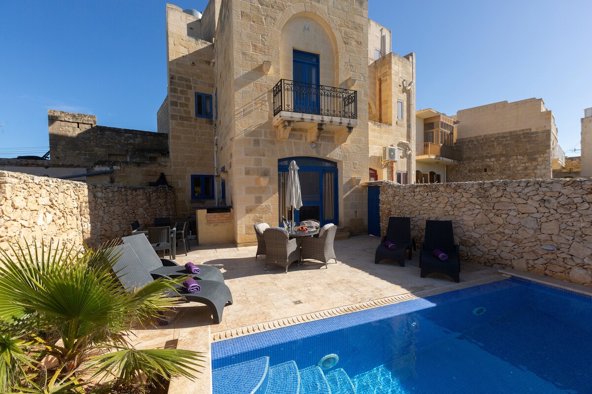 Escápate al tranquilo entorno de Gozo en nuestra villa única de 300 años con características de carácter originales y 2 piscinas. Los huéspedes disfrutan del uso privado de las piscinas exteriores e interiores (spa) y de la barbacoa/comedor en la azotea iluminada con una mesa para 10 personas. El encantador interior está equipado con cocina completa, lavavajillas, aire acondicionado, Smart TV 4K, WiFi y mesa de air-hockey. La base perfecta para una escapada relajante, privada y aislada, a poca distancia del bullicioso casco antiguo.