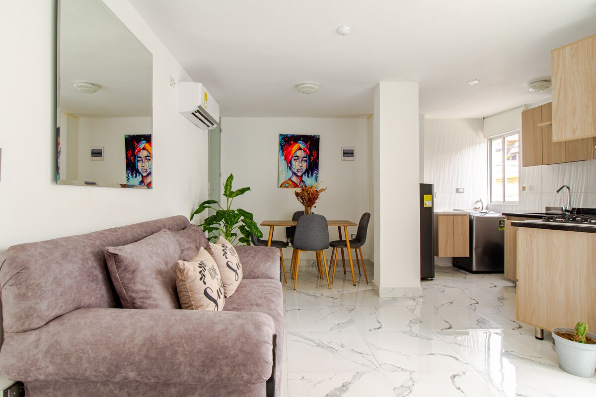 Apartamento moderno de una habitacion, totalmente equipado en el corazón de Santa Marta. Con hermosas puestas de sol frente al mar y una variedad de comodidades que incluyen piscina, sauna y gimnasio para que sus vacaciones sean lo más cómodas y relajantes posible. A poca distancia de la Marina Internacional de Santa Marta y su hermoso paseo marítimo que lo llevará al centro histórico más antiguo de América continental y donde encontrará una amplia variedad de restaurantes y vida nocturna.