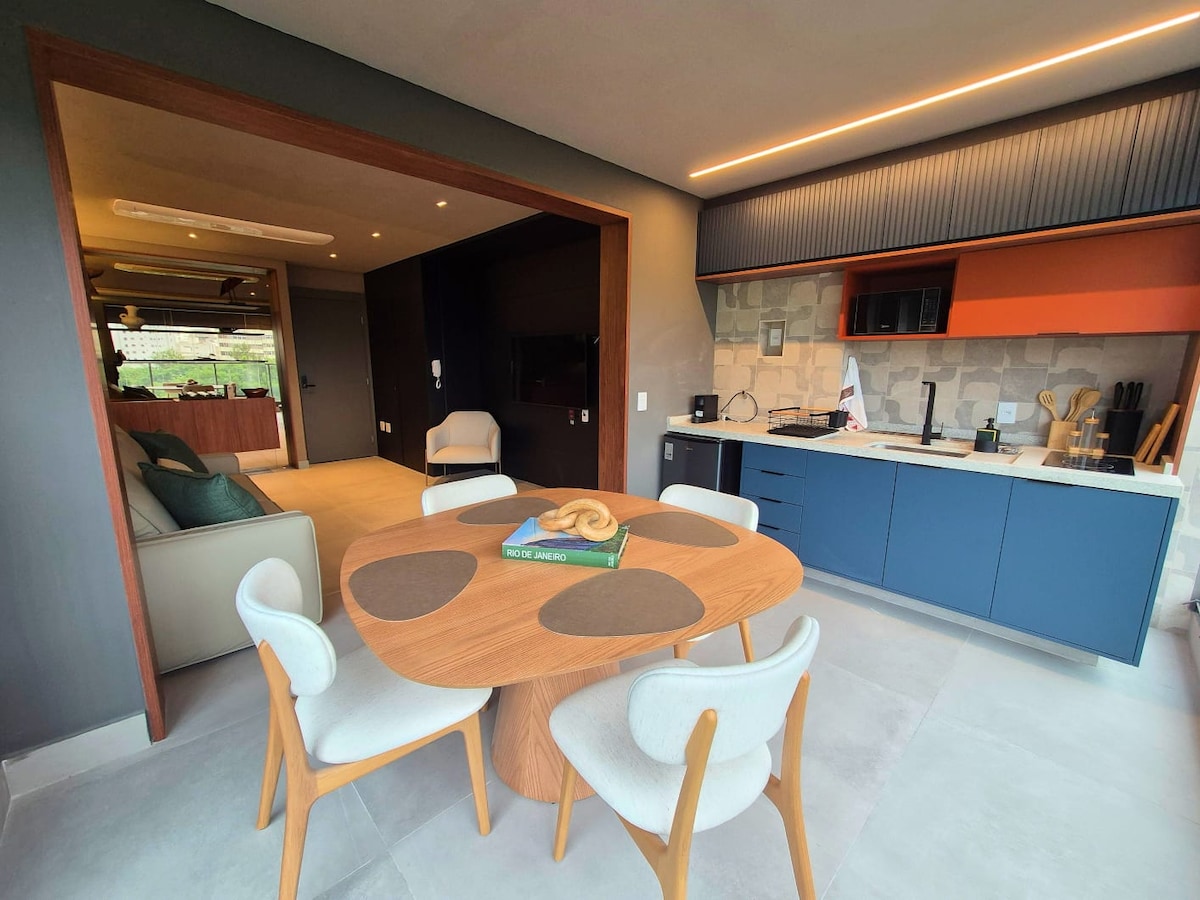 Disfruta de una experiencia elegante en este lugar bien ubicado. Estudio encantador, bien decorado y acogedor con un espacio de estacionamiento en un edificio con una piscina en la azotea. Sala de fiestas, lavandería, ludoteca, gimnasio y tienda Pão de Açúcar Minuto (minimercado) en la planta baja. Con la opción de cerrar/abrir el vidrio del balcón en un aire de casa con la seguridad de un condominio. Muchos gabinetes y artículos para el hogar le dan al huésped la sensación de estar en casa. Wifi de fibra VIVO de 600 Mbps.