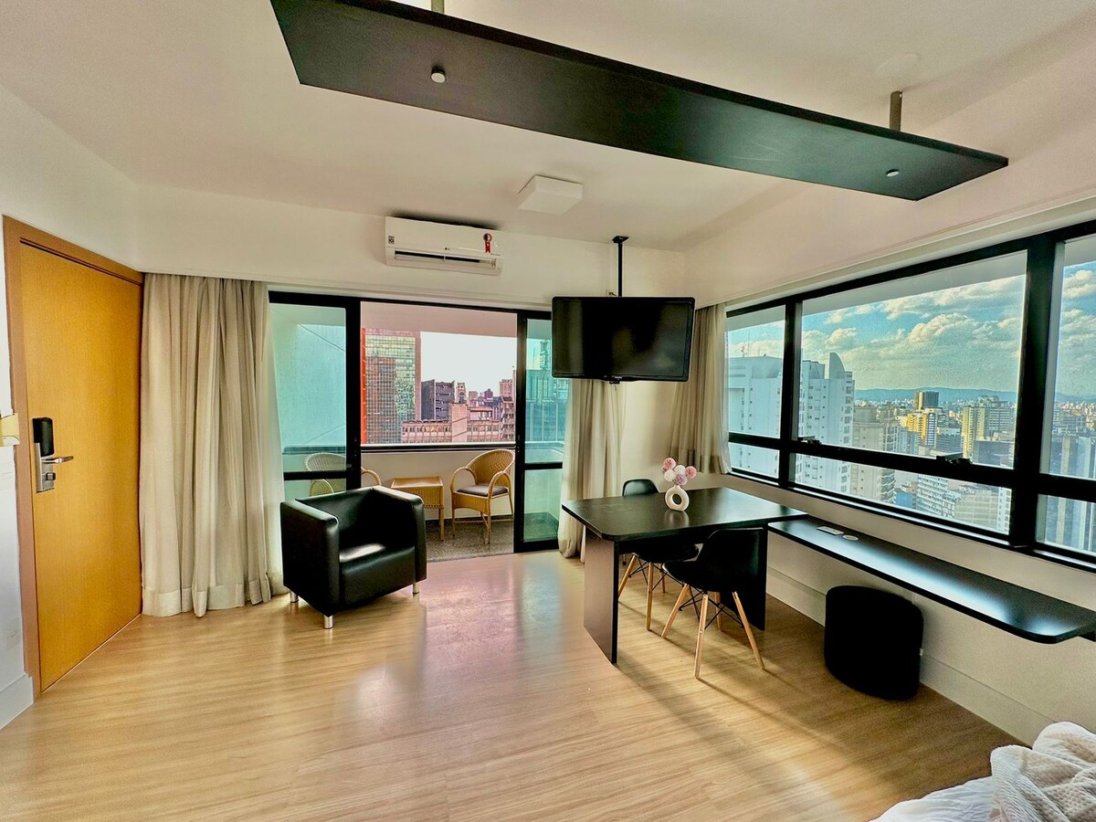 Apartamento completo com ar-condicionado no quarto, TV, cozinha compacta e varanda com vista incrível de São Paulo. Wi-Fi gratuito e limpeza diária. Prédio com recepção 24h, piscina, sauna, academia e jacuzzi coletiva. Estacionamento e café da manhã pagos à parte, servidos no restaurante do térreo. A uma quadra da Paulista, atrás do MASP, perto de tudo!
