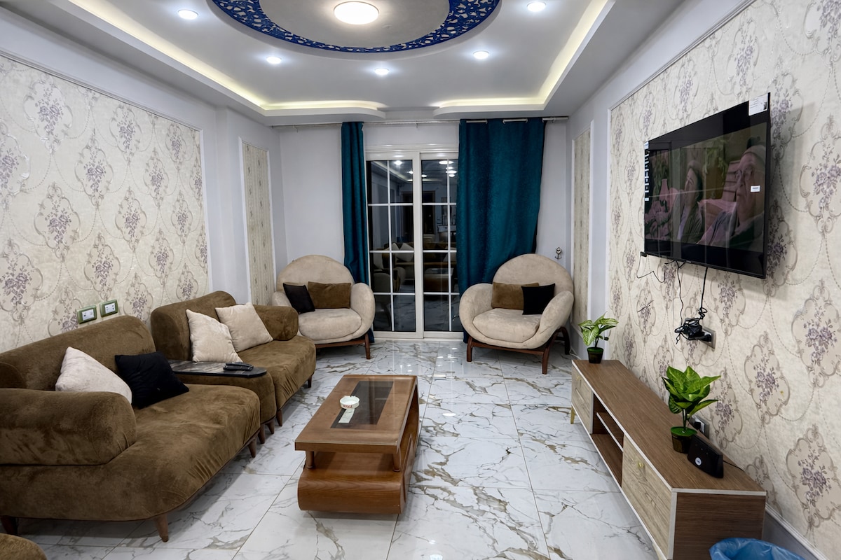 Stay in a spacious and comfortable 3-bedroom apartment in a prime central location, just steps from the Corniche and close to the sea. Perfect for families or groups, the apartment offers easy access to cafés, shops, and the vibrant coastal atmosphere of Alexandria. ⭐ Highly rated by previous guests for cleanliness, comfort, and location. The home features elevator access, fast Wi-Fi, self check-in, free parking, and four TVs—making it ideal for everyone.