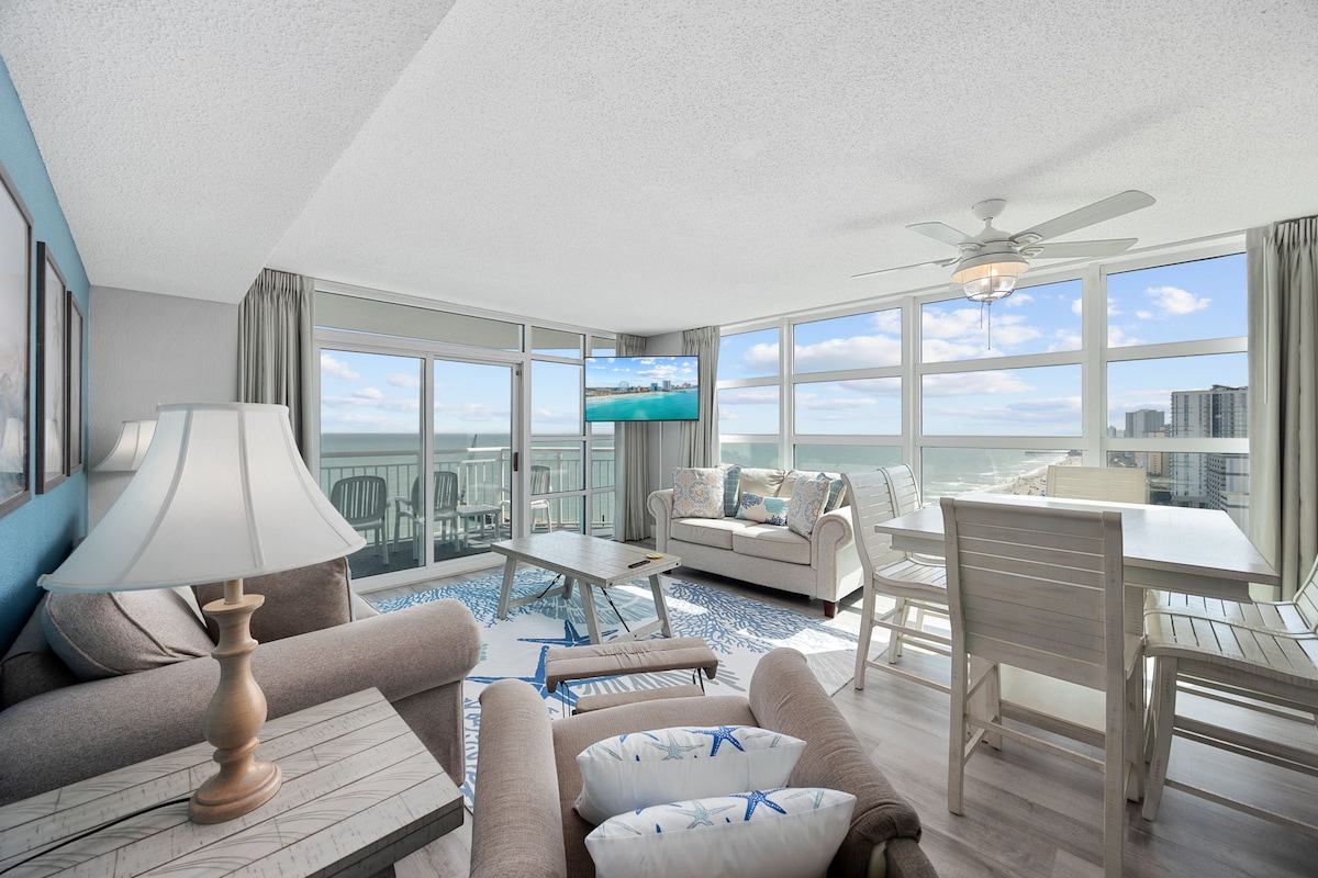 ¡El amplio balcón y la espectacular vista al mar es lo que hace que este elegante apartamento destaque! La playa es visible desde casi todas las habitaciones de este espacio y tendrás acceso a una piscina y a un bonito café en la playa justo afuera. Esta es una ubicación privilegiada para disfrutar de restaurantes, dar un agradable paseo por la playa o ¡no hacer nada en absoluto! Cuando no estés disfrutando del sol o de todo lo que Myrtle Beach tiene que ofrecer, encontrarás que el apartamento en sí es acogedor, está bellamente decorado y es muy cómodo.