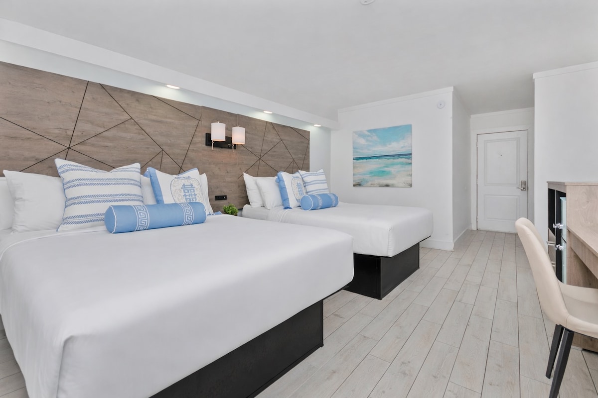 Just steps from the sand, our newly refreshed 2BR suite at Fin’s Inn & Suites is perfect for families and small groups seeking sun, space, and simplicity. With three plush queen beds, a sleeper sofa, a full kitchen, fast Wi-Fi, and AC, there’s room to relax and reconnect. Kids love the game lounge and outdoor pool, while grown-ups appreciate the walkable access to the beach, Boardwalk, dining, and attractions. A breezy, fun-filled escape made for memories.