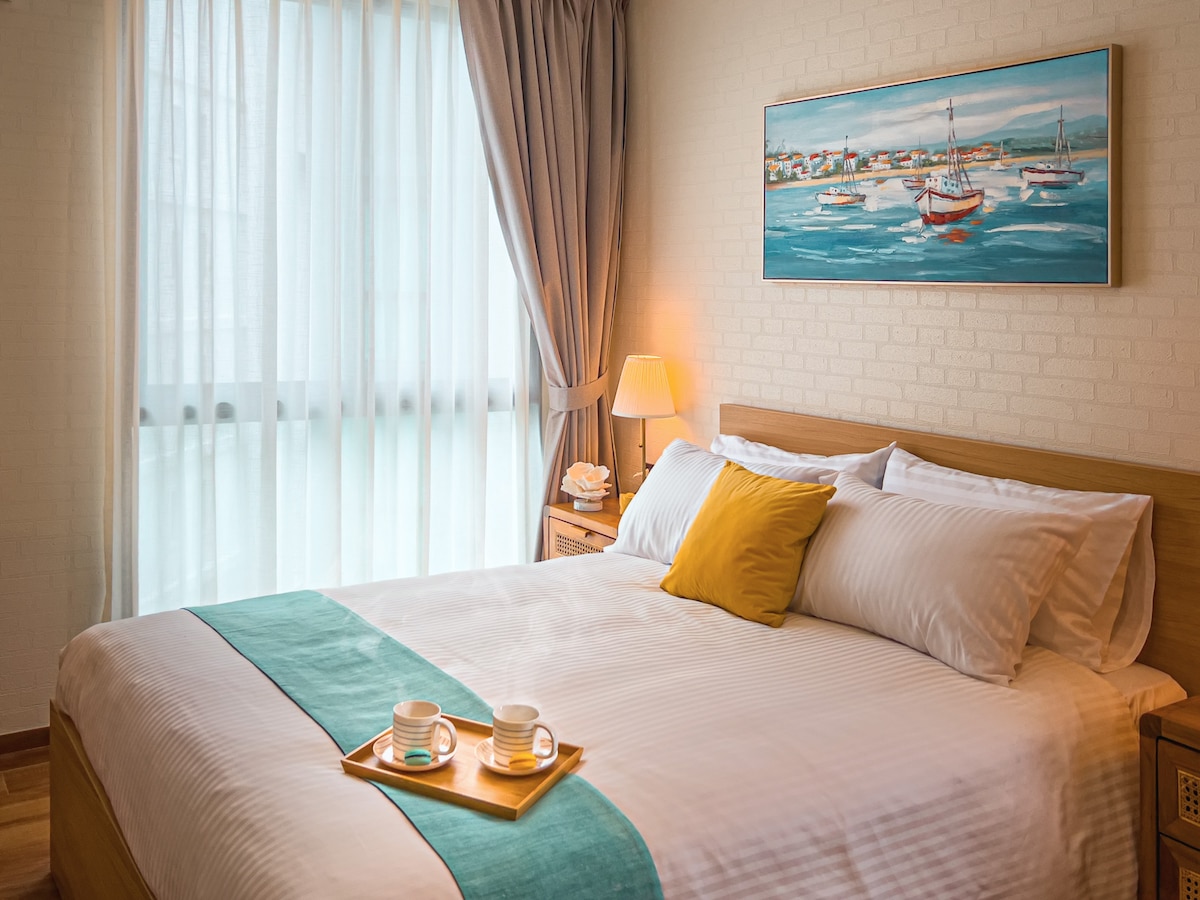 绝佳海上日落观景屋顶花园泳池&带厨房浴缸阳台一室一厅温馨房间+24小时保安