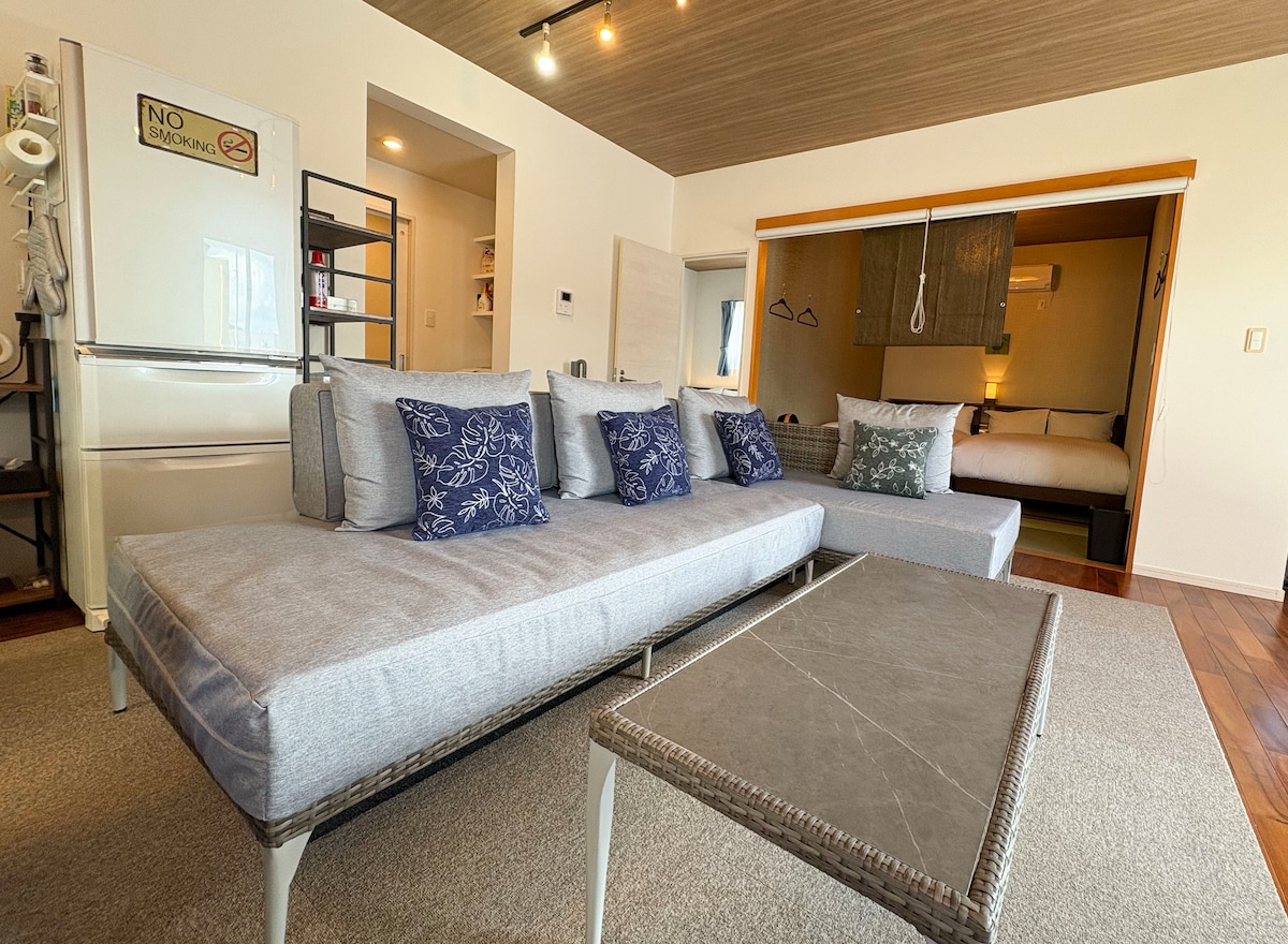 Esta posada recién construida, ubicada en el tradicional y hermoso distrito arbolado de Fukugi de Imadomari en el pueblo de Nakijin, parte norte de Okinawa, es ideal cuando se visita el acuario Churaumi y el castillo de Nakijin. Se encuentra a solo 30 segundos a pie de la playa rodeada de un hermoso mar, arena blanca y la naturaleza de Okinawa. La elegante posada de estilo occidental de nueva construcción con un interior moderno y hermoso y una habitación de tatami de estilo japonés ofrece una estancia rica, limpia y cómoda.
