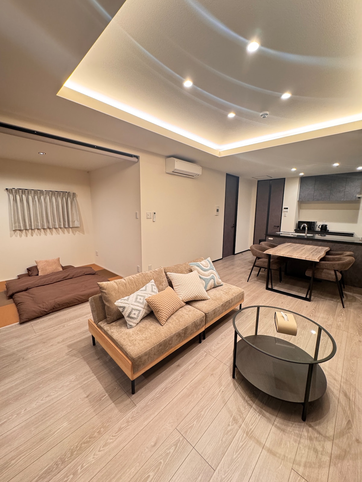 Esta es una villa de patio de estilo japonés de alta calidad que es realmente adecuada para familias y grupos.Toda la casa es una casa unifamiliar, con dos pisos, un área utilizable de unos 130 metros cuadrados y un espacio amplio, que es extremadamente raro en Osaka. La casa tiene capacidad para 9 personas cómodamente con 7 tatamis y una cama tamaño king de 1,8 m.El diseño de la casa es razonable, puede ser compartido por muchas personas, pero también garantiza la privacidad. A unos 6 minutos a pie de la estación de Namba, a 1 minuto a pie de Shinsaibashi y otras áreas centrales, fácil de recorrer, mientras se mantiene un ambiente tranquilo y cómodo. La casa tiene un patio de estilo japonés, que combina el ambiente tradicional japonés con la comodidad de la vida moderna.Todos los muebles y ropa de cama están cuidadosamente dispuestos, adecuados para viajes familiares, reuniones de amigos y estancias largas. Si quieres un espacio habitable verdaderamente espacioso, tranquilo y de estilo japonés en Osaka, este lugar es ideal