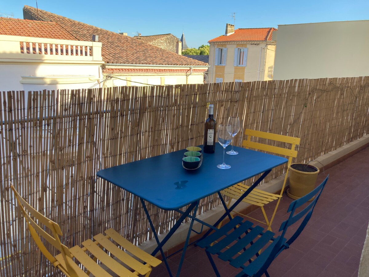 Centro histórico de Narbona. En el primer piso de una casa burguesa con balcón y vistas al canal de la Robine. Apartamento con aire acondicionado. Gran sala de estar, cocina equipada , TV LED, WiFi. Habitación de 20 m²: ropa de cama nueva, cama de 160 cm A lo largo del canal se encuentra a 8 minutos a pie del centro histórico de Narbona (Ayuntamiento, Catedral, Les Halles, restaurantes, bares...) A 10 minutos caminando de la estación central . A 10 minutos en coche de los Grands Buffets. A 20 minutos en coche de las playas de Gruissan y Narbona.