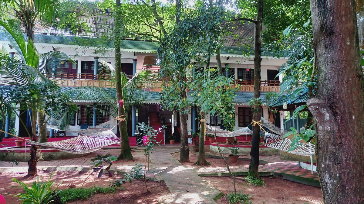 🏡 4 dormitorios independientes con baño privado, adecuados para 8 huéspedes. Hasta 2 camas adicionales disponibles (@ INR 500/cama) • Edificio de una sola planta con todas las habitaciones en la planta baja para facilitar el acceso. - Cocina común • Espaciosa zona de comedor con todo lo esencial. • A poca distancia a pie de la playa de Mararikulam. • Piscina. • Desayuno y wifi de cortesía, ideal para trabajar a distancia. • Estacionamiento en las instalaciones. • Almuerzo y cena tradicionales de Kerala disponibles previa solicitud.