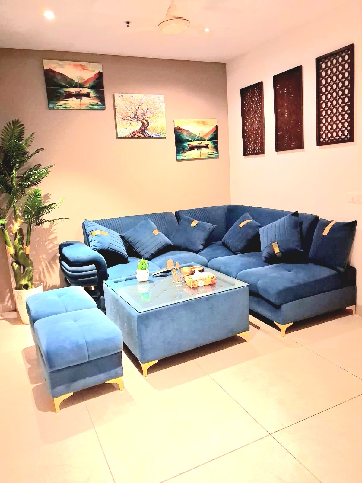 Relájate en este espacio tranquilo y elegante. La habitación es lujosa con baño privado, escritorio de trabajo. El apartamento tiene una enorme terraza con una vista de asiento y estacionamiento. La terraza cuenta con una pérgola automática y un bar al aire libre. La sala de estar cuenta con un televisor de 65 pulgadas con vistas a la terraza y un rincón de lectura. La cocina está bien equipada con todos los elementos esenciales, como un microondas, horno, placa de cocción, nevera, purificador de agua, utensilios de cocina, tostadora, hervidor, cafetera, arrocera, cubiertos y vajilla.