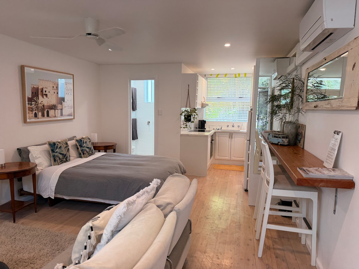 Newport Beach, en las playas del norte de Sídney, se está convirtiendo rápidamente en un destino vacacional exclusivo para veraneantes australianos e internacionales por igual. No solo es famosa por sus muchos lugares populares para practicar surf, como Newport Peak y Reef, sino que también es ideal para nadar, ya que hay socorristas durante los meses de verano, de octubre a abril. El icónico Newport Hotel está a 10 minutos a pie de la casa y otros restaurantes de calidad están aún más cerca, ubicados en Newport Village. El pueblo también ofrece una amplia variedad de tiendas, desde grandes supermercados hasta tiendas boutique. Palm Beach, o Summer Bay como se conoce en «Home and Away», está 15 minutos más al norte en coche. Si la vida nocturna o un ritmo más rápido es más tu estilo, Manly está a menos de media hora en coche, viajando hacia el sur. Desde aquí, el ferry de Manly puede llevarte a través del puerto de Sídney hasta el distrito financiero para pasar un día de turismo. La playa está a menos de 5 minutos por un extremo de la carretera y, si decides explorar el otro extremo de la carretera, encontrarás el histórico castillo de Bungan, construido en 1919. Majestuosamente encaramado en el cabo con vistas a Bungan Beach, cada piedra de este castillo fue traída por su propietario alemán y ahora está catalogado como patrimonio. Un verano mágico te espera en Myola Beach Studio, estamos deseando recibirte. Los huéspedes tendrán acceso privado al estudio en un terreno llano, apto para discapacitados o ancianos. Los propietarios están en el lugar, en la residencia principal, si es necesario. El apartamento está a pocos pasos de las orillas de Newport Beach y a poca distancia en coche de Bungan Beach. Se encuentra en lo que se conoce como el Triángulo de Oro, donde se puede encontrar una gran variedad de tiendas y restaurantes.