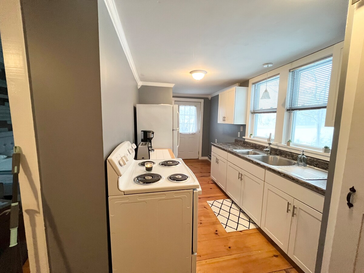 Minicasa de nueva construcción en una carretera privada de montaña sin salida, aislada y ubicada en el bosque junto a antiguas paredes de piedra y muchos árboles. Hay una pequeña cocina con una mininevera/estufa y un horno para que puedas preparar comidas, una cama tamaño queen, un sofá con almacenamiento y un baño con una ducha. Ideal para una pareja o un viajero solo que busca desconectar y observar la naturaleza en el trabajo desde las grandes ventanas. ¡Hay un fogón y sillas Adirondack en el patio si no hace demasiado frío!