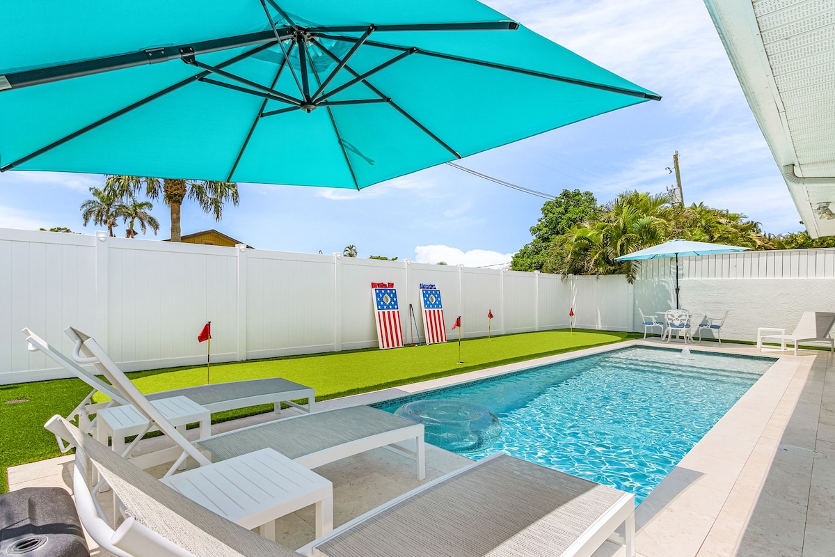 Oasis 🌴 privado a 3 minutos de la playa de Vanderbilt 🌊 ¡Bienvenido a nuestro trozo de paraíso en Naples Park, Florida! Ubicado a 3 minutos de las prístinas arenas de Naples Beach, las mundialmente famosas tiendas y restaurantes Mercato y Publix/Walmart. A solo 15 minutos al norte de la 5 .ª Ave Downtown District. Nuestra casa renovada cuenta con un patio trasero privado vallado con una nueva piscina climatizada de agua salada, una zona de minigolf personalizada y muchos juegos al aire libre para cada huésped. ❤️ Simplemente, el refugio acogedor más perfecto para tu escapada a la playa.🏖️