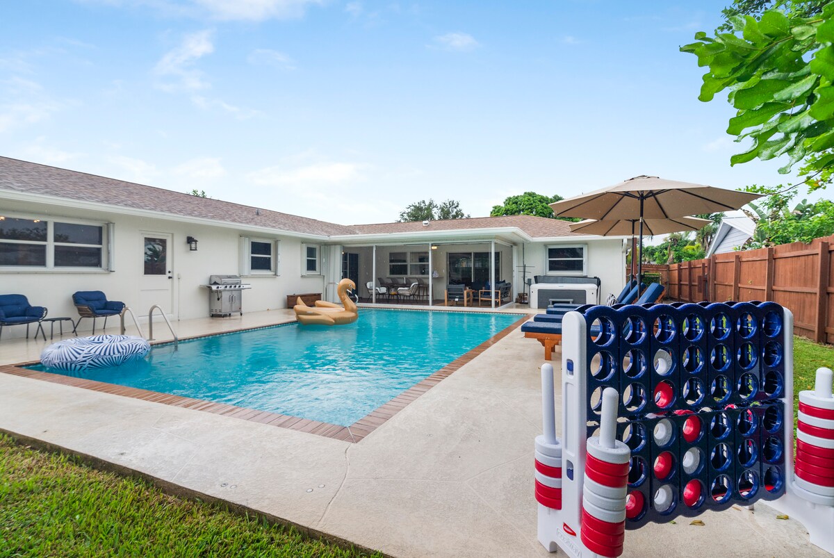 Casa de vacaciones espaciosa y familiar con tu propio refugio privado junto a la piscina de agua salada en el corazón de Jupiter, Florida. Esta casa de 4 dormitorios acomodará a todo tu grupo con lujo moderno. Mientras que el lujo dentro del patio tropical, la piscina de agua salada y el campo de minigolf te esperan en tu patio trasero. Parrilla al aire libre, horno de pizza de ladrillo y sala de juegos con mesa de billar. A solo unos minutos en coche de las tiendas locales o de la playa. A 25 minutos del aeropuerto PBI.