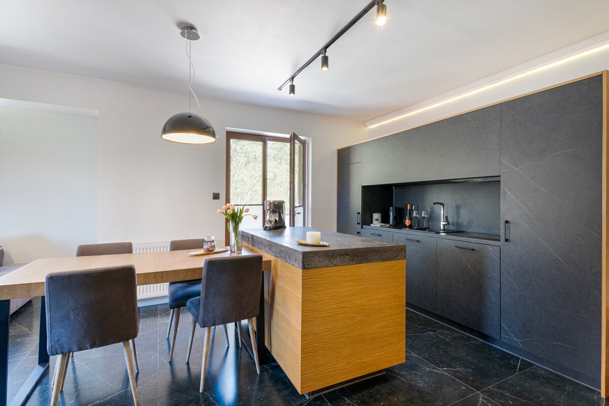 La casa Bielawy ha sido especialmente diseñada para la relajación. Cuenta con una moderna piscina climatizada sin cloro (oxígeno activo) con un banco de masajes, un jacuzzi para 6 personas y una sauna de alta calidad. ¡El amplio jardín incluye un parque infantil, mesa de ping pong, barras trepadoras, cama elástica y cancha de voleibol! Dentro de la casa, los huéspedes pueden relajarse junto a la chimenea, jugar al futbolín, a la Xbox o al póquer. La cocina bien equipada ofrece las condiciones ideales para cocinar. Muy cerca hay hermosos lagos y bosques.