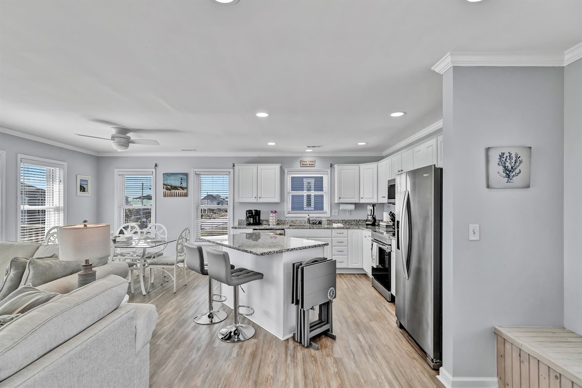 ¡Bienvenido a «The Salt Box» en la hermosa Surf City, Carolina del Norte! Nuestra casa de campo de 1957 de 3 dormitorios y 2 baños ha tenido una renovación completa por dentro y por fuera, justo a tiempo para el verano. The Salt Box tiene un estilo costero relajado e informal diseñado para recordarte las cabañas de surf de antaño... todo con comodidades modernas, por supuesto. Con una mezcla de muebles nuevos y vintage, un poco de boho... estamos seguros de que te encantarán las impresionantes vistas al mar, la proximidad al acceso a la playa y las salas de estar al aire libre.