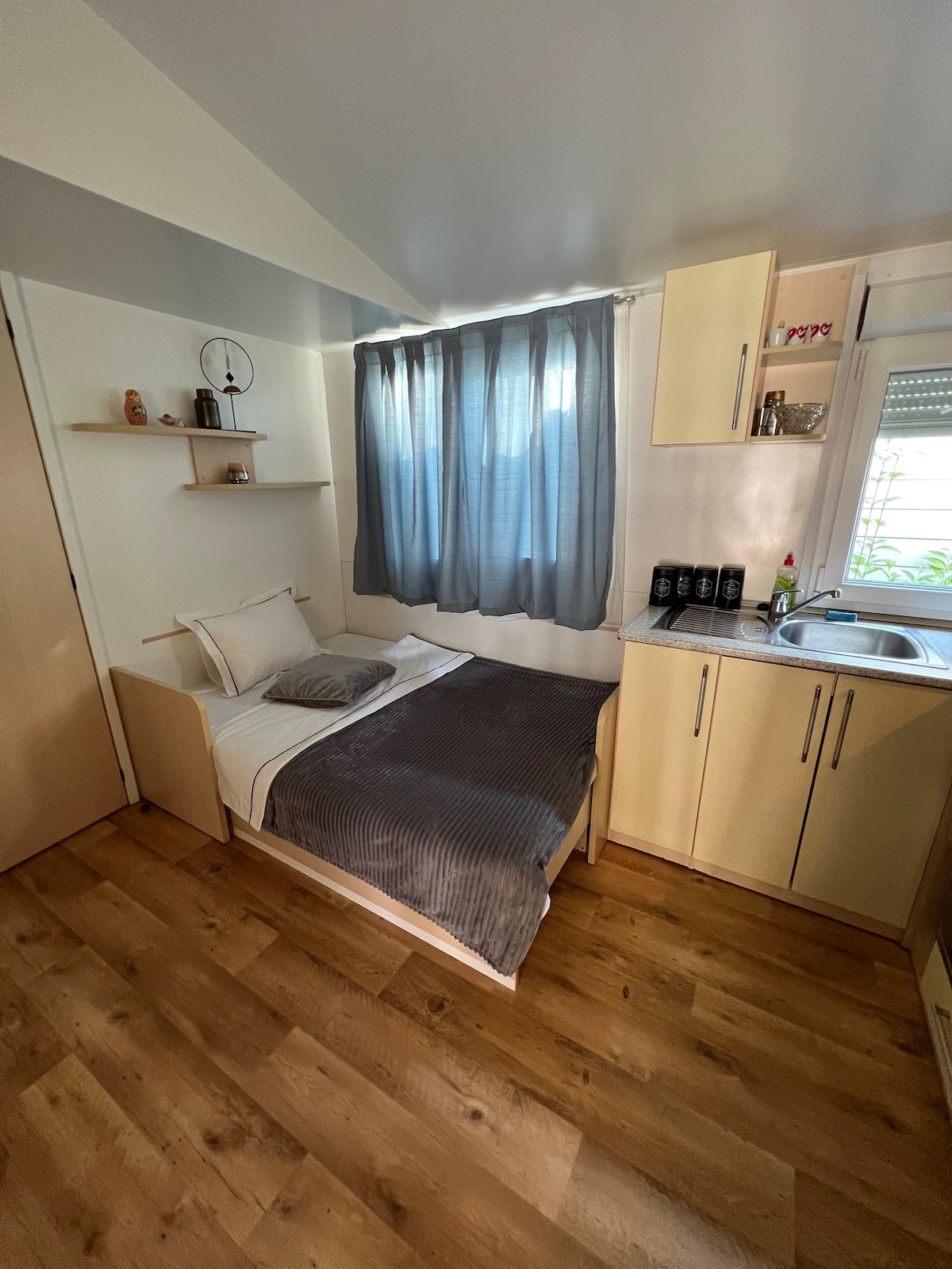 Studio apartman od 30-ak m2, sastoji se od spavaće dijela sa bračnim krevetom, kupaonice sa tuš kabinom te kuhinje i blagovaone te dnevnog boravka sa kaučem na razvlačenje i možemo ugostiti 3 osobe. Apartman je zapravo jednim stranom spojena kućica, nalazi se u prizemlju, na zemljištu veličine 3 300 m2