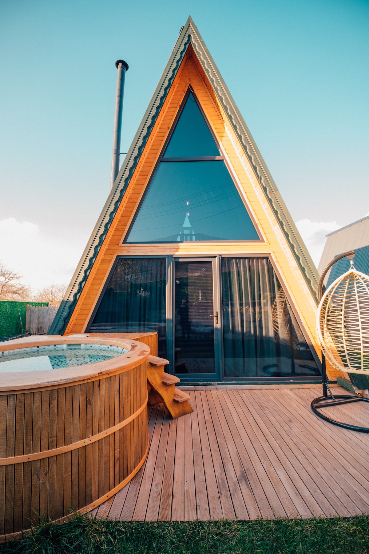 Es una mini piscina tamaño jacuzzi (175 cm de diámetro, 90 cm de profundidad). El concepto de habitación en nuestras instalaciones comienza desde el jardín;puedes balancearte en el columpio en tu propio jardín independiente, preparar tu cena en la barbacoa o tomar el té con el canto de los sonidos del pájaro. Nuestros bungalows tienen una estructura mimalista de madera. Este lugar memorable es más que ordinario. Envíanos un mensaje para obtener más información. (bungalow apto para familias)
