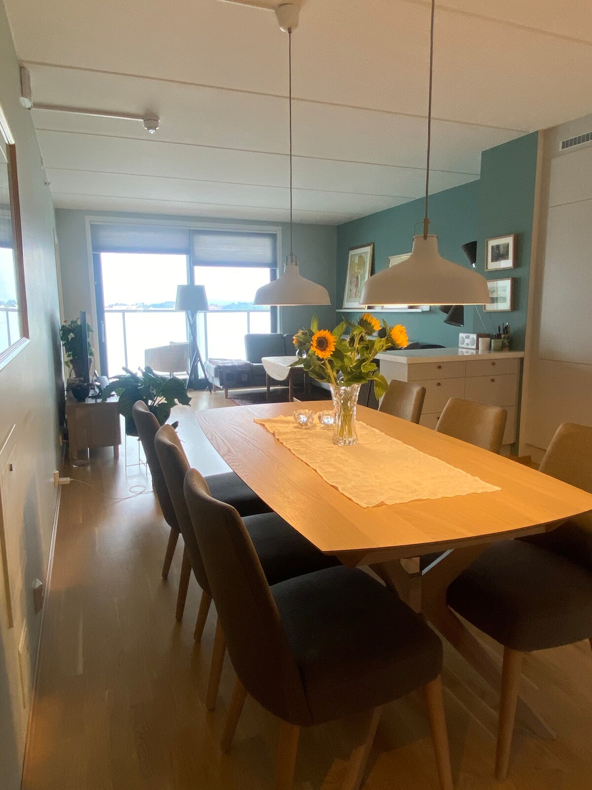 Romslig og fin 2-roms leilighet med balkong og utsikt over hele Oslo. Ligger i et rolig strøk med gratis gateparkering. Send gjerne melding om noen ønskelige datoer er opptatt i kalenderen. Hvis de ikke er booket til Airbnb-gjester, er det mulighet for å gjøre endringer. Leiligheten har spisebord med plass til 8 personer, en daybed-sofa, kjøkkenområdet med et eget lite spisebord, kingsize seng og god plass til oppbevaring av klær. Matbutikk: 100m Flybuss/buss: 300m Trikk/t-bane: 15 min å gå