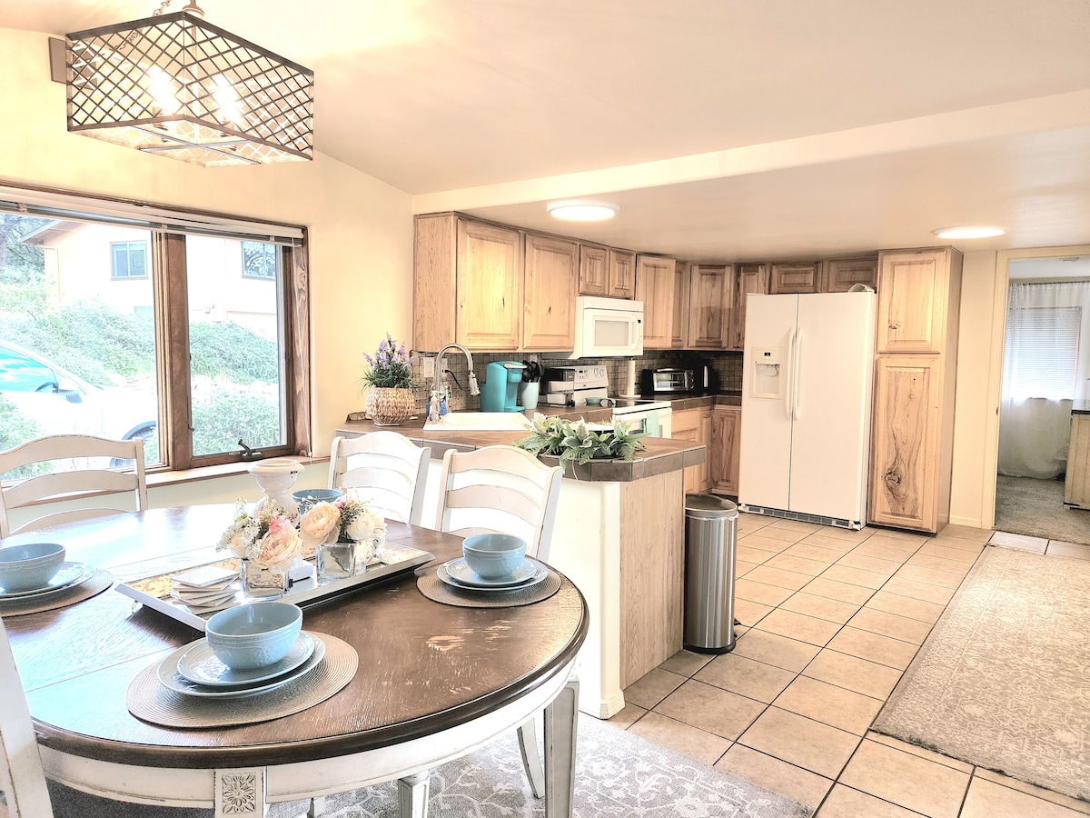 Esté en paz en esta hermosa casa en Oak Creek, cerca de Sedona.Recién remodelada. Escapada con una tranquila terraza envolvente (de nueva construcción) donde se escucha el arroyo.La escalera desde la terraza tiene acceso directo al arroyo: puedes pescar o jugar en el arroyo en menos de un minuto.Acurrúcate junto a dos chimeneas de madera. Con una ubicación única cerca de Slide Rock y West Fork y a minutos de la vibrante Sedona.Conduzca dentro y fuera de Sedona de forma tranquila.Complejo forestal con restaurante en el lugar y hermoso espacio.