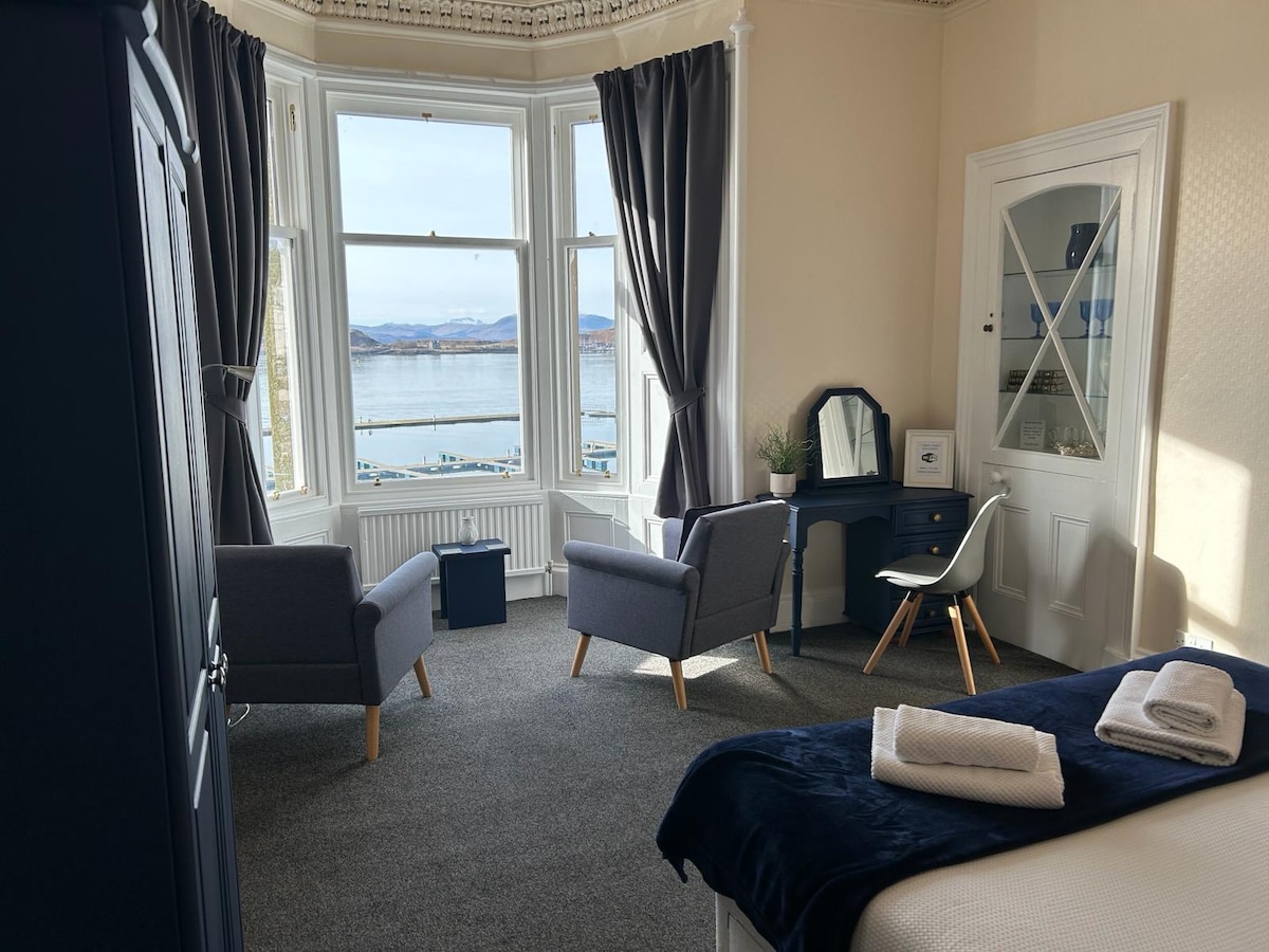 Inmejorables vistas panorámicas de la bahía de Oban y la Isla de Mull desde este inmaculadamente renovado apartamento en la planta superior con vistas a la marina. Especialmente popular entre los visitantes de los Estados Unidos y del extranjero, este espacioso penthouse (90 m2) ofrece comodidades modernas de uno de los edificios victorianos más emblemáticos de Oban, y antiguo hogar del periódico The Oban Times. Observa los ferris ir y venir por la mañana con tu desayuno, y luego relájate con una copa de vino observando espectaculares puestas de sol sobre las islas.