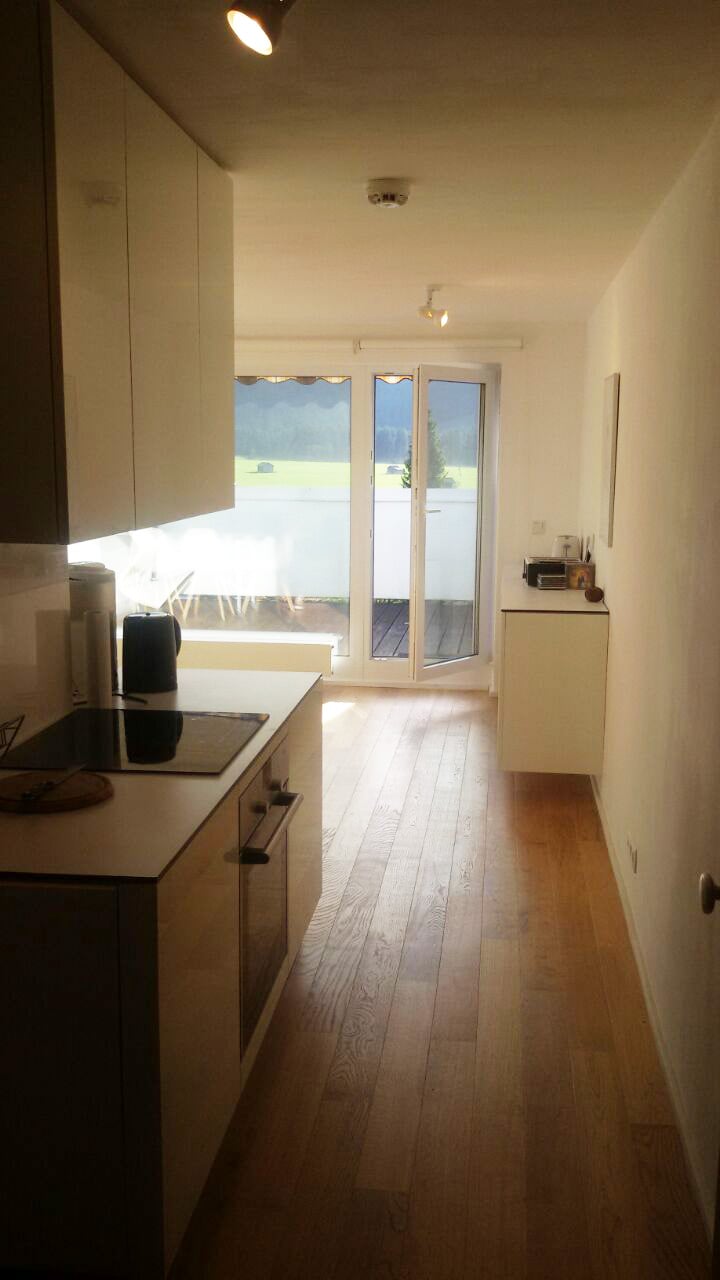 The 50sqm apartment was put together with a lot of love to detail. The main living area has a fully equiped kitchen, a dinning area and a sleeper sofa. The bedroom and bath are seperate from the living area. Outside there is a terrace with a view on to the mountains. The house is located in a quiet neighborhood, approximately 10 minutes walking distance to the village, 3 minutes to the ski-jumping stadium and 7 minutes to the Nebelhorn Ski Lift. There is enough space for skis, bikes, etc.
