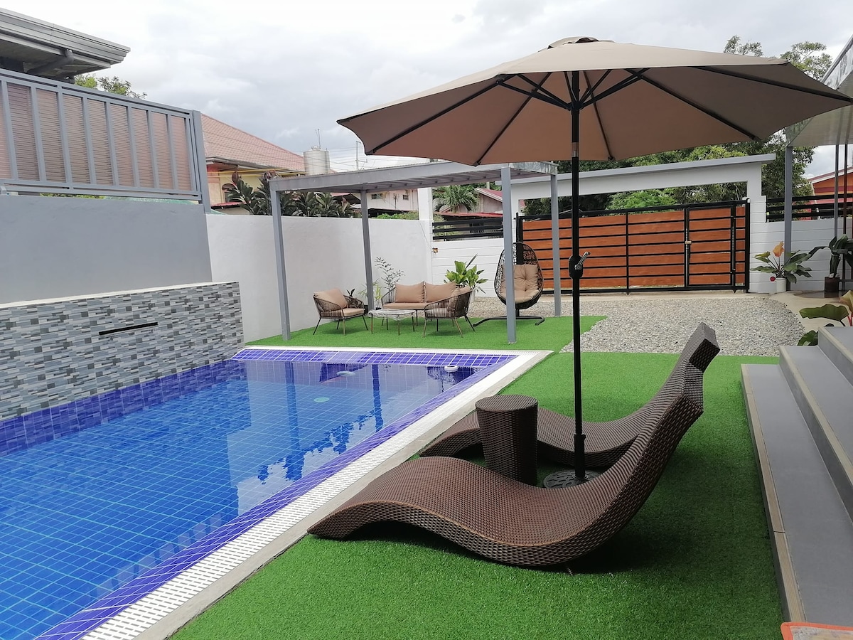Escape to our private micro-resort compound, with 2 luxurious villas, tucked in a lush farm village in San Jose, Batangas near Lipa. Each villa sleeps 4 (total occupancy of 8), with en-suite bathrooms and high-end finishes. Cook with ease in the full stand-alone kitchen, relax in the oval pool, or unwind in the tropical garden with a calming fountain. Enjoy outdoor dining with our charcoal grill and spacious grounds. Perfect for quiet getaways with family or friends, offering comfort & serenity.