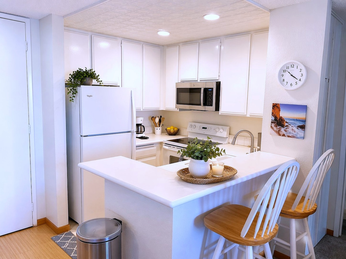 Bienvenido a un apartamento recién remodelado con vistas al mar a pocos pasos de la playa en North Coast Village. Todo es nuevo, desde los electrodomésticos de cocina de acero inoxidable con encimeras de cuarzo blanco hasta el hermoso baño con ducha a ras de suelo. La cocina tiene armarios nuevos y todo lo necesario para cocinar una comida casera si lo deseas. Hay una cafetera y se proporciona café. Se utilizó un tema de playa para decorar todo el apartamento que realmente te hace sentir como si estuvieras en el paraíso.