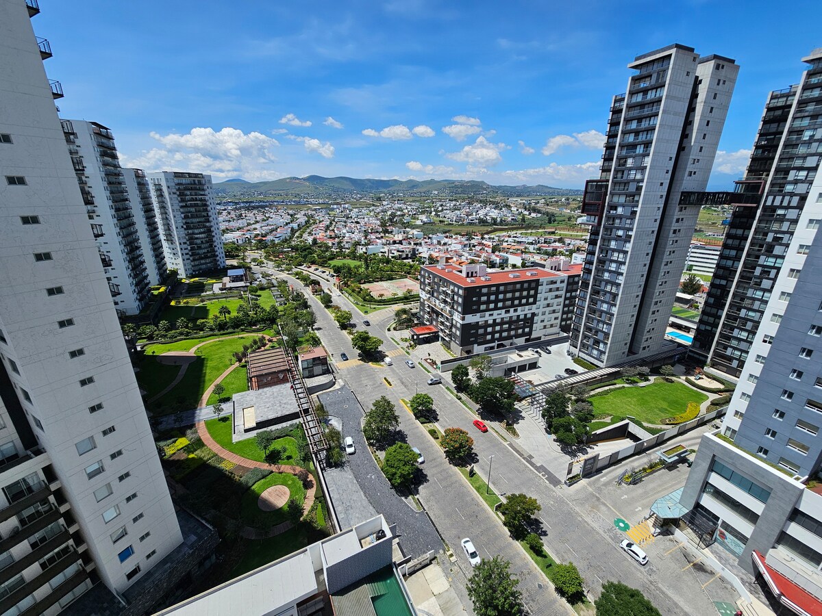 Hermoso y cómodo departamento de lujo en la zona más bonita y tranquila de Puebla. Ubicado en el piso 10 de un edificio con alberca y gimnasio. A tan sólo 5 minutos de Sonata en coche y a 5 minutos caminando de los parques más bonitos de Lomas de Angelópolis.