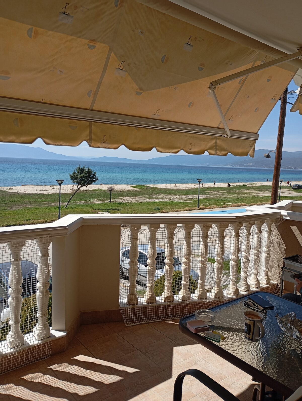 A beautiful apartment, only 10 minutes away by foot and 2 minutes away by car from downtown center. 50 meter away from the beach and only 1 minute by foot. Spectacular view of the sea and the “Paggaio” mountain. Super market, restaurants, pharmacy and everything you need are very close!