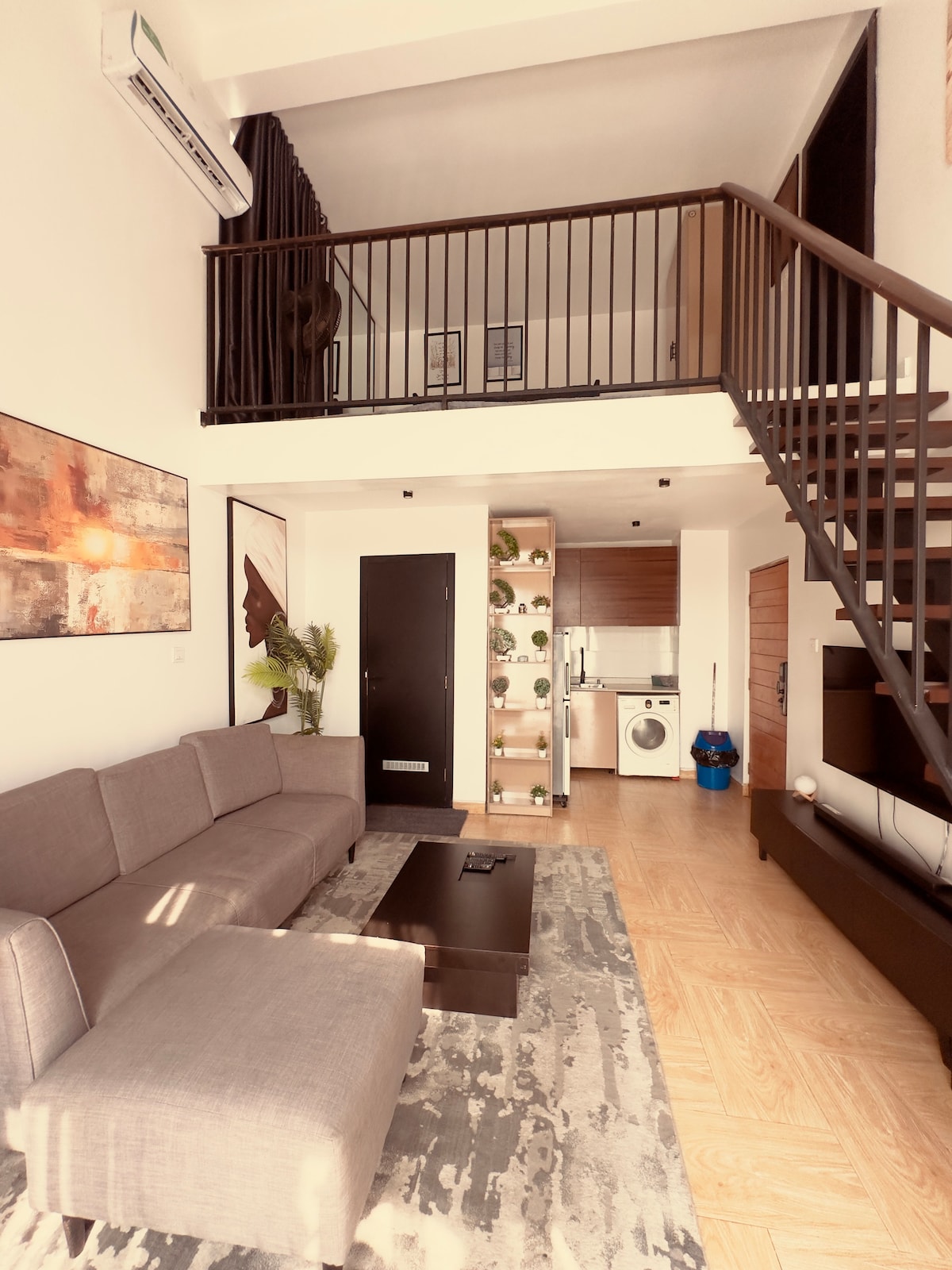Bienvenido a este apartamento loft bellamente diseñado, creado con un toque único y moderno. Entra en este encantador espacio lleno de una decoración elegante y un diseño que no solo mejora el ambiente, sino que también se suma a la funcionalidad. No te olvides de los grandes ventanales que ofrecen increíbles vistas panorámicas, así como un acogedor mini balcón para disfrutar del aire fresco. Además, hay una terraza en la azotea que promete vistas impresionantes para que tu experiencia de vida sea aún más especial.