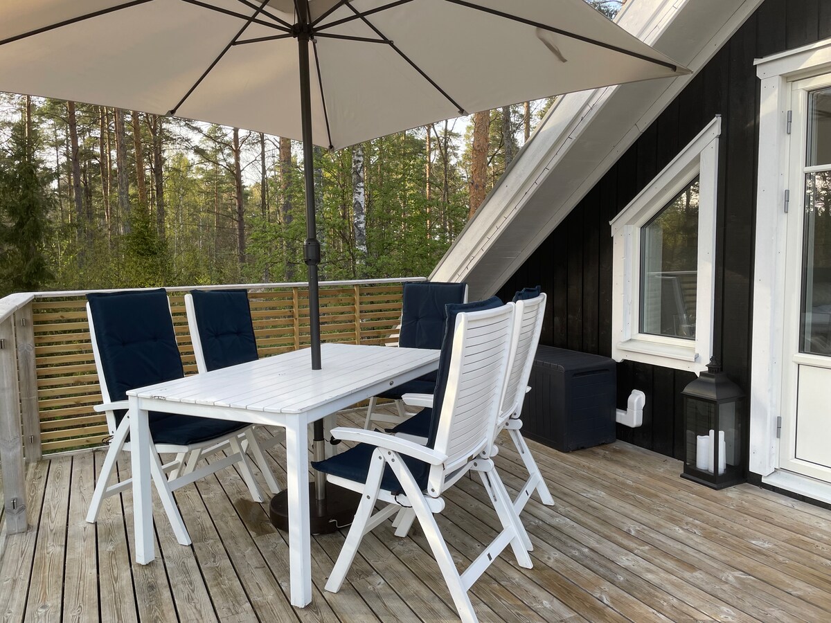 Nybyggd lägenhet/studio med öppen planlösning, ca 50kvm. 6 bäddar med ny dubbelsäng, 1 dagbädd 2x80, 1 bäddsoffa 2x80 Lägenheten är på andra våningen i ett fristående hus (garage). Stort kök med kyl/frys, diskmaskin, ugn, microvågsugn, kaffebryggare. Badrum med dusch + toalett. Terass i söderläge (havsutsikt) med parasoll. möjlighet att hyra båt och kanot Egen brygga med bord, paviljong och sandstrand Under Juni-Aug endast hela veckor (söndag) Medtag sänglinne o handduk Städning ingår ej