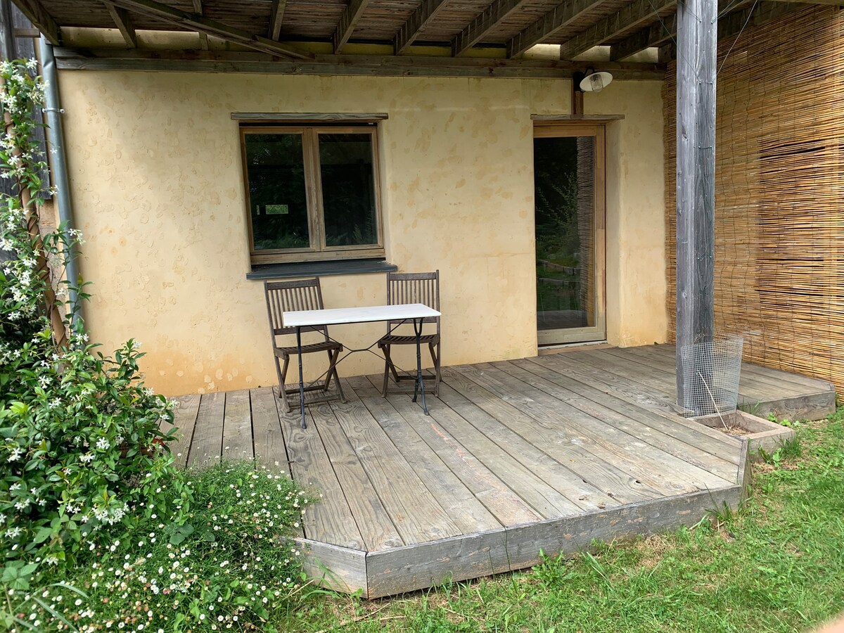 Déjese seducir por este encantador alojamiento. Sencillo y rústico en un antiguo granero de madera en el primer piso, se puede disfrutar de su terraza con mesa, sillas y tumbona. Su entrada privada con su baño "ducha , lavabo e inodoro seco" independiente está reservada para usted en la planta baja. El alojamiento está climatizado para mayor comodidad. una zona de cocina está disponible a 50 m en la cabaña "la Guinguette" tiene todo lo necesario "nevera cocina de gas fregadero ..