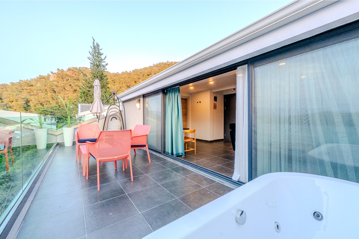 Montañas y mar... Todas las bellezas de Fethiye se unen en esta terraza. La suite 301 es un espacio habitable que ofrece tanto respiración como plazas inolvidables con un jacuzzi con vistas al mar en su gran terraza, un sofá y un columpio. El amanecer y el atardecer se convierten en un evento separado aquí. Mientras que la obra original de un artista local agrega carácter a la habitación, la sala de estar y la cocina complementan cada detalle para estadías largas. Con capacidad para hasta tres personas, esta habitación está diseñada para momentos especiales.
