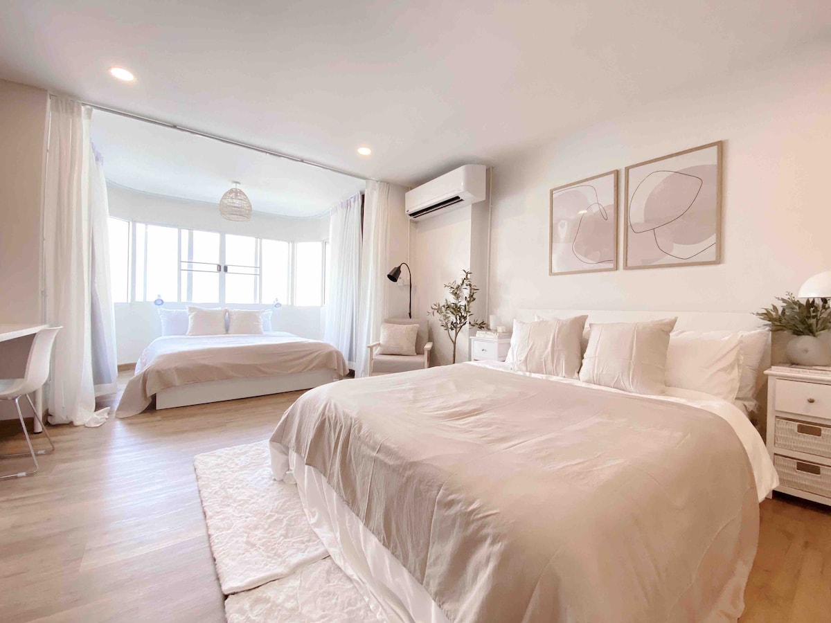 Soak up the modern charm of this nice decorated room. Fully furnished with all electric appliances that enhance the comfort of your stays ! The entire place will be yours [bedroom, bathroom,kitchen & living space] Soft&comfortable King size mattress & Muji bedsheet set. Free Wifi , 60" SmartTV + free Netflix, Air purifier, washing machine with drying function , iron , microwave oven , fridge, Electric hob & cooking utensils. Bathroom with rain shower & hot water machine.