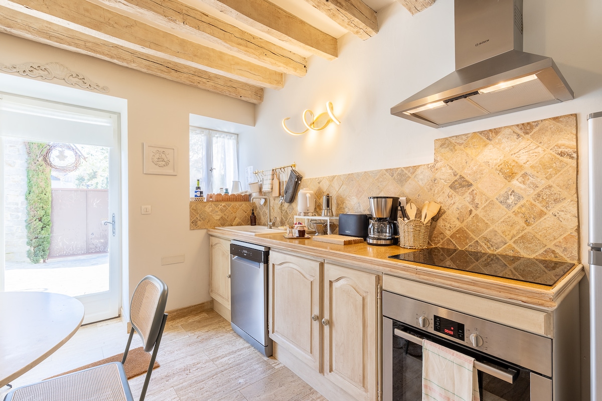 Casa de piedra con patio y cocina al aire libre.