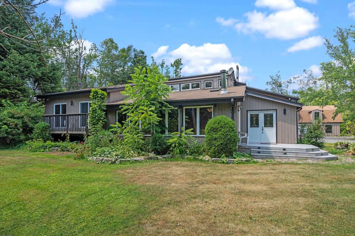 PLEASE READ! Mt. St. Louis & Horseshoe Valley at doorstep! This is a bright, large and private walk-out GUEST SUITE (basement apartment). Hot tub, patio, fire pit & secluded path in the woods to enjoy nature. Kitchen is equipped with an induction cooktop and all things necessary, even wine bottle opener:) Open concept living room/kitchen/dining room with TV & Roku. Bedroom is a work of Art: dark, mysterious and romantic! Custom Queen bed made from weathered barn wood salvaged from our property.