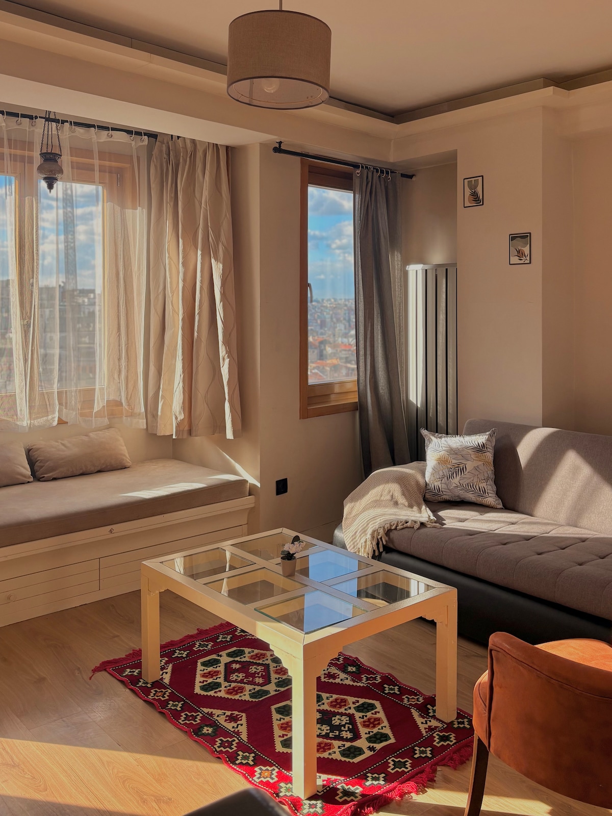 Cozy 1BR apartment on the 6th floor of a boutique 7-storey building, just a few minutes’ walk from Taksim Square and Istiklal Street. Enjoy a bright lounge with a comfy sofa and window daybed, a handy kitchenette for simple cooking, and a modern bathroom with a shower cabin. The area is lively and there can be some street noise, and the walk from the square includes a small hill – but you’ll be staying in a warm, homey base right in the heart of Istanbul.