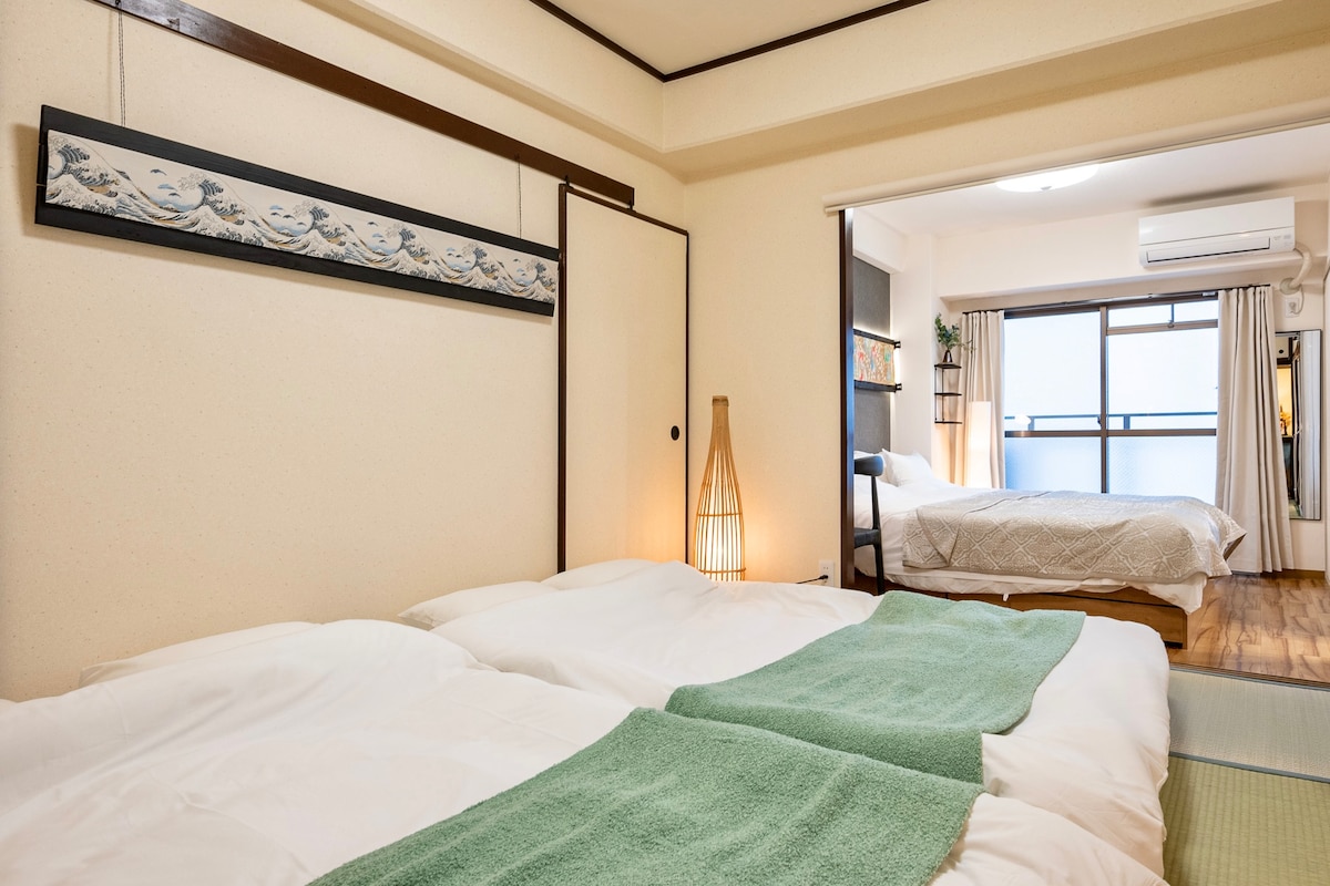 - Este apartamento ofrece un alojamiento espacioso y cómodo, así como el beneficio adicional de una pequeña cocina. - Se encuentra a solo 10 minutos a pie de la estación de Nagahoribashi. Puedes ir caminando a la estación de tren más cercana, la estación de Namba, en 15 minutos. Es más fácil ir a pie a la tienda de comestibles (Daiso) a solo 11 minutos. Los niños menores de 6 años se alojan gratis. Te recomiendo que te quedes aquí no solo con tus amigos o familiares.