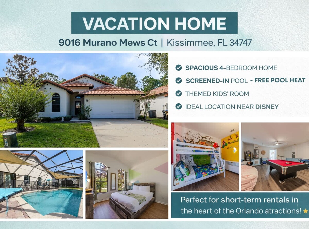 Modern, spacious 9BR/5BA vacation home in gated resort near Disney & Universal! Ideal for families and groups—sleeps 28. Enjoy a private pool, spa, outdoor projector, tiki bar, BBQ, and epic game room with gaming console. Kids will love the superhero room with indoor slide, rock wall, ball pit, and swings. Walk to resort amenities: pools, waterslides, pirate park, arcade, gym, bar, sports courts & more. Close to golf, dining, shopping, and all the magic Orlando has to offer!